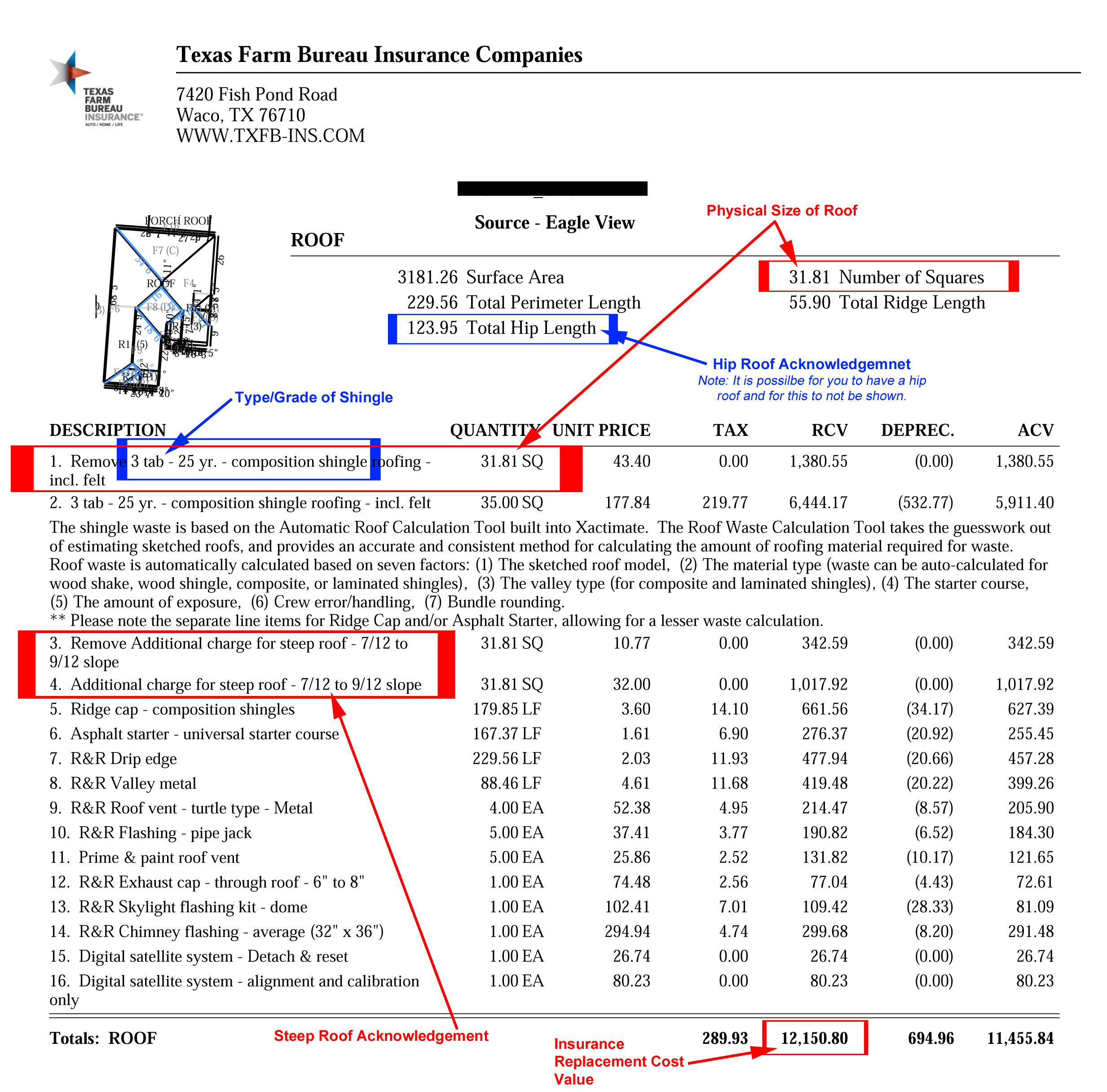 The pitch (or angle) of your roof is important because the steeper a roof is the more dangerous it is and the more time it takes to work on. By definition any roof with a pitch greater than or equal to 7/12 (rise/run) is considered steep. To keep things simple we don’t need to know the exact pitch of your roof, just if your roof is or has been identified as steep or not. The easiest way to determine this is to review your insurance claim. If your roof is steep it will be shown in the claim like the example on the right.